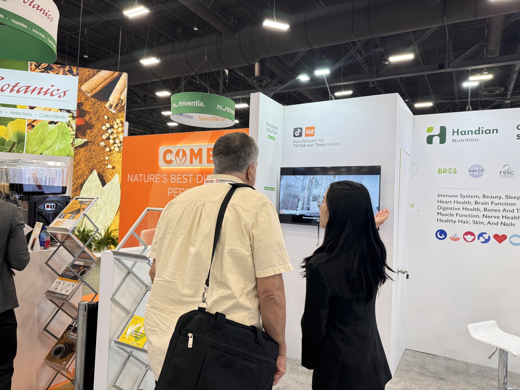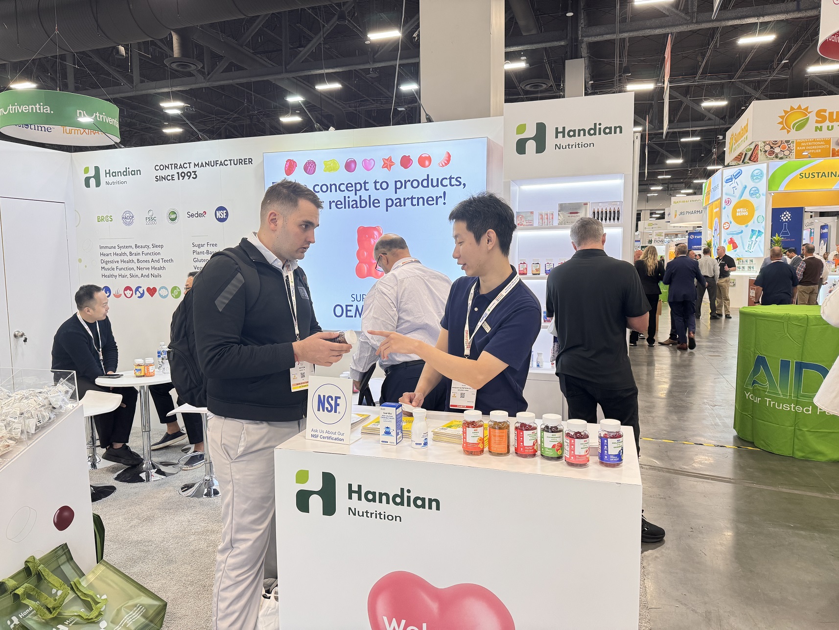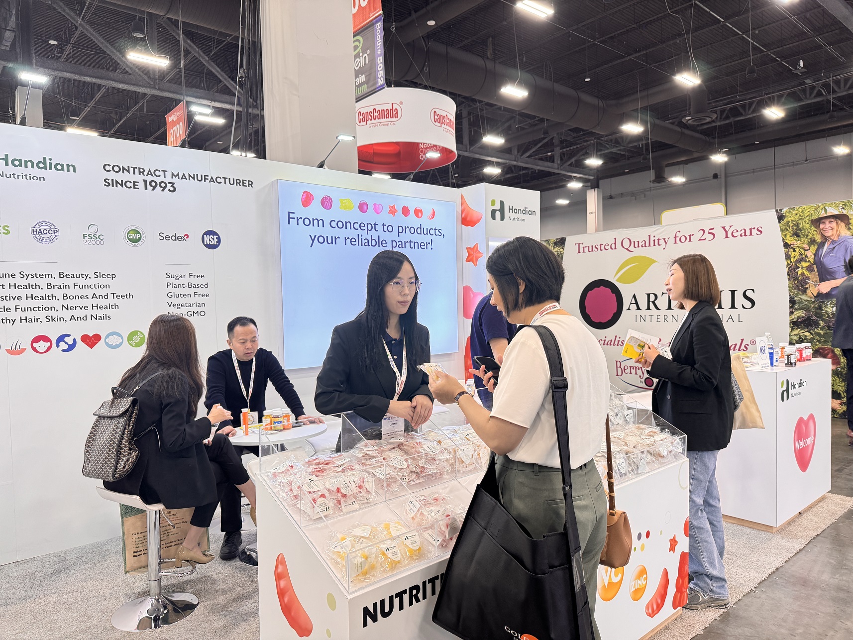 我們的團(tuán)隊(duì)詳細(xì)地為新老客戶介紹了我們多樣的營養(yǎng)健康產(chǎn)品、內(nèi)部生產(chǎn)能力。客戶對漢典不斷創(chuàng)新產(chǎn)品結(jié)構(gòu)的能力給予了極大的肯定,并對我們的一系列新品投以深切的關(guān)注。